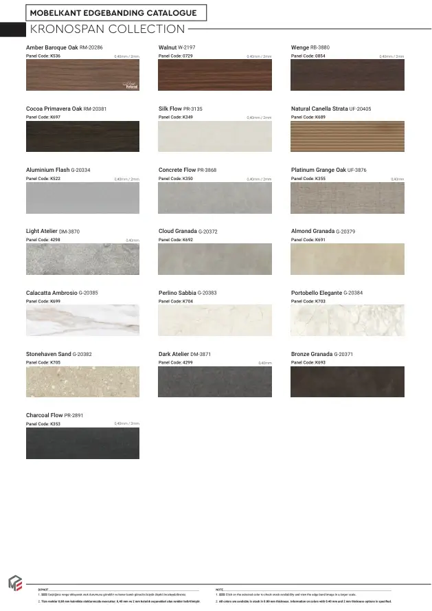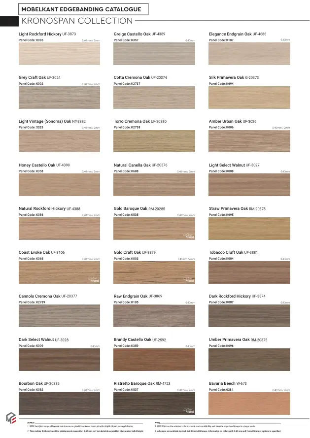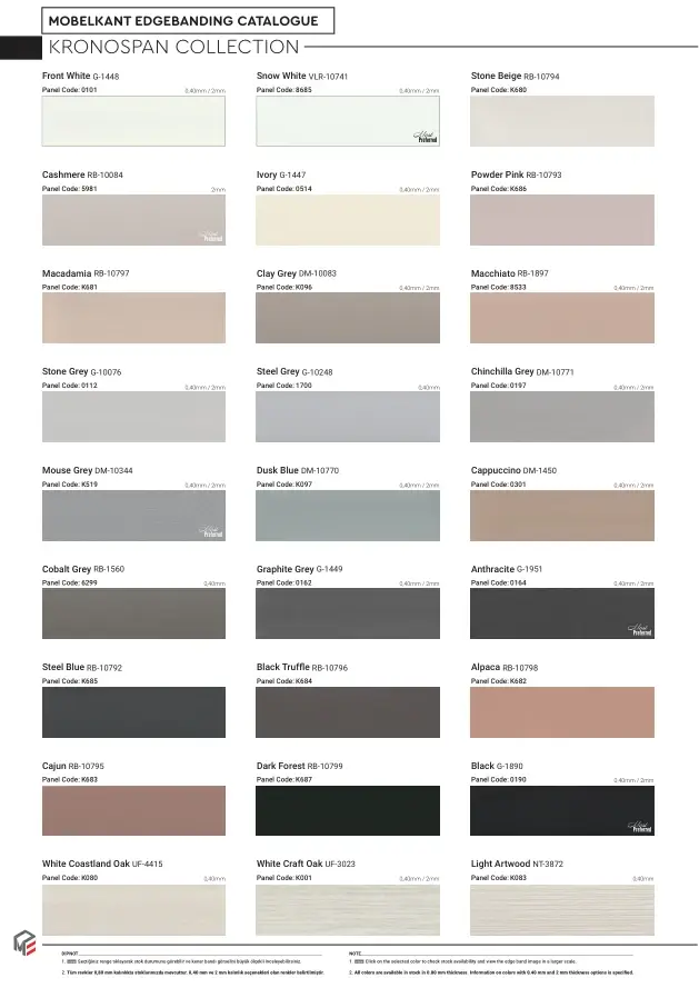 Kronospan’ın en yeni renkleri ve ‘most preferred’ (en çok tercih edilen) koleksiyonunu da içeren 73 rengini mükemmel bir uyumla eşleştirdiğimiz özel kenar bandı koleksiyonumuz, tasarımlarınız için hazır.